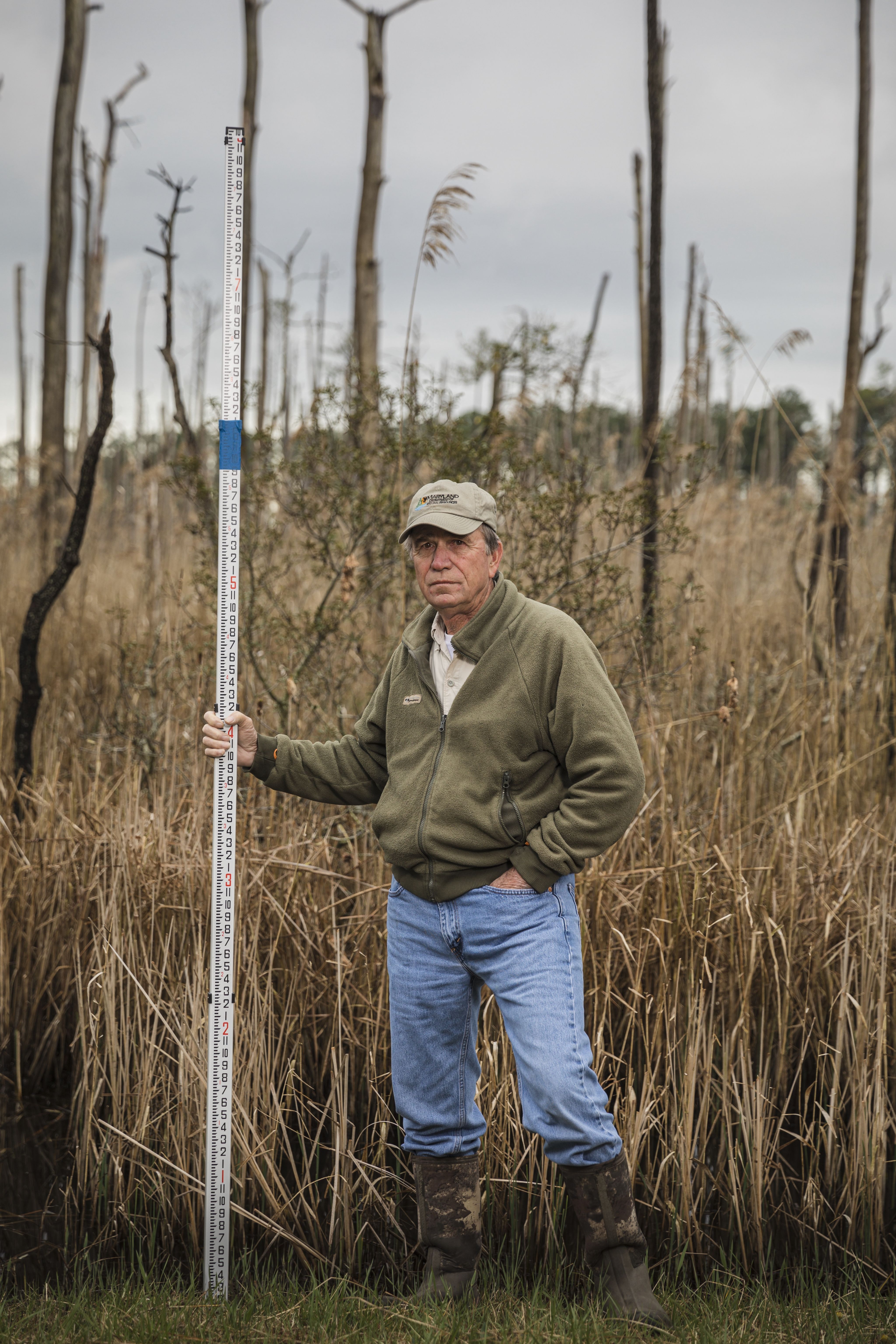 Photo 2: Donald Webster, one of Michael Snyder’s interviewees, standing in the remains of a forest that has been destroyed by rising salt water. The blue band marks the projected water level in this spot in the year 2100. Photo: Michael Snyder