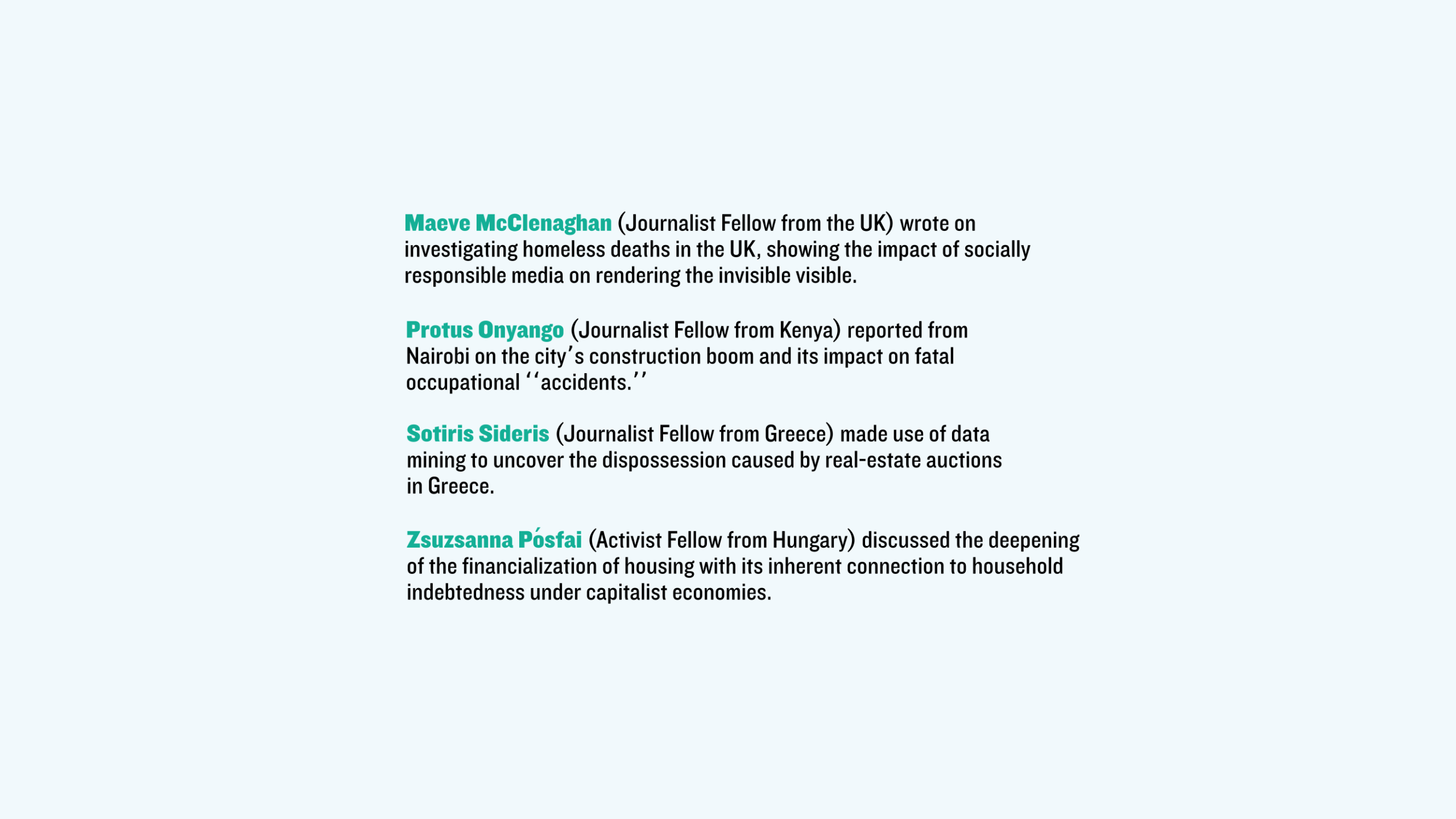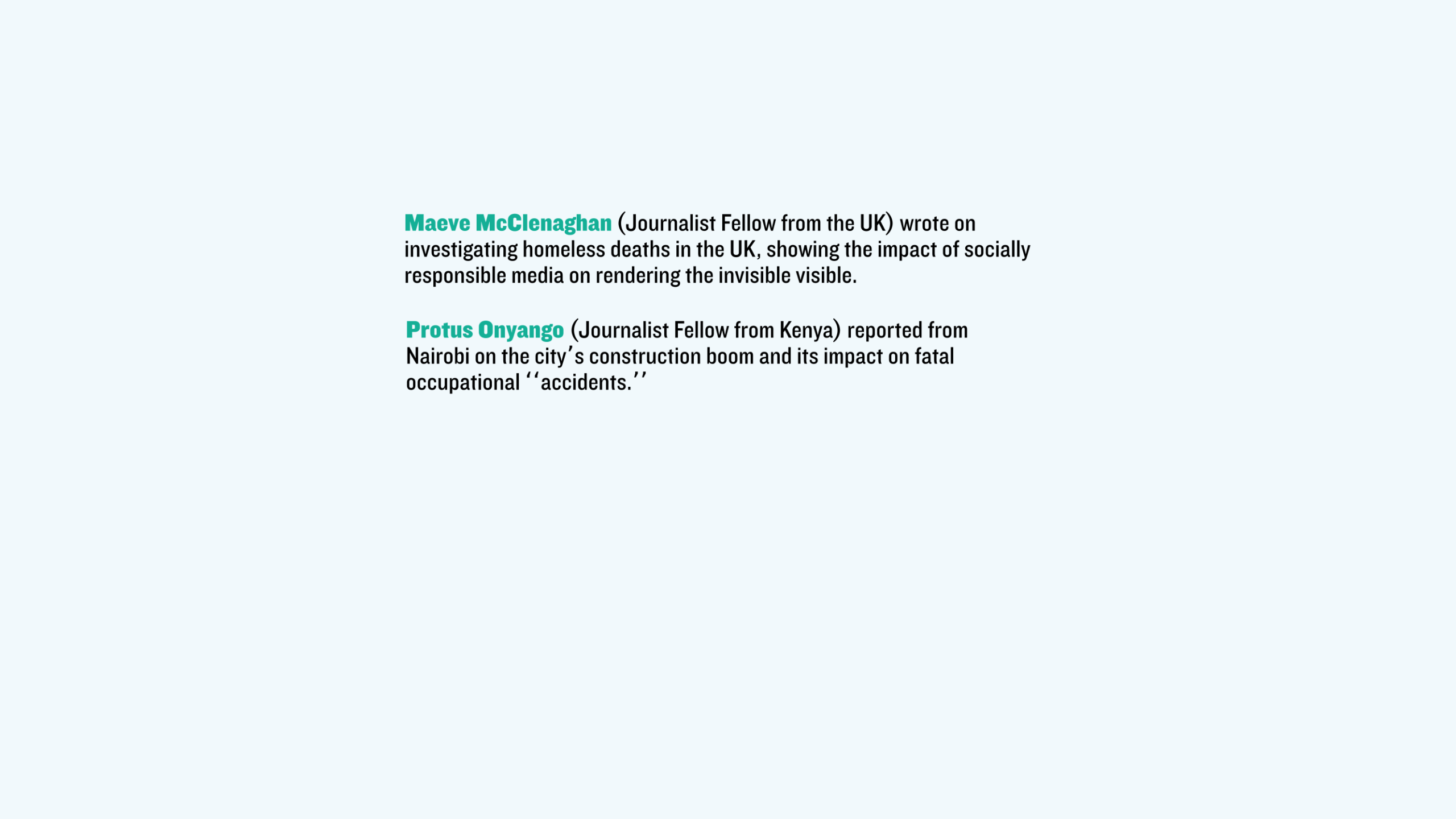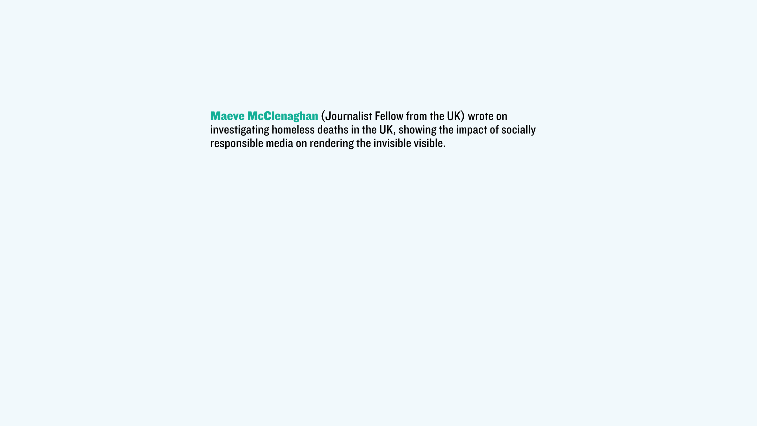 Maeve McClenaghan (Journalist Fellow from the UK) wrote on investigating homeless deaths in the UK, showing the impact of socially responsible media on rendering the invisible visible.