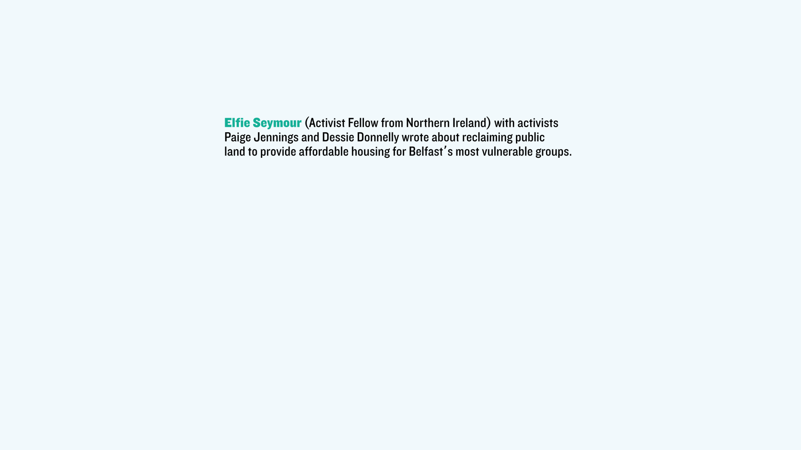 Elfie Seymour (Activist Fellow from Northern Ireland) with activists Paige Jennings and Dessie Donnelly wrote about reclaiming public land to provide affordable housing for Belfast’s most vulnerable groups.