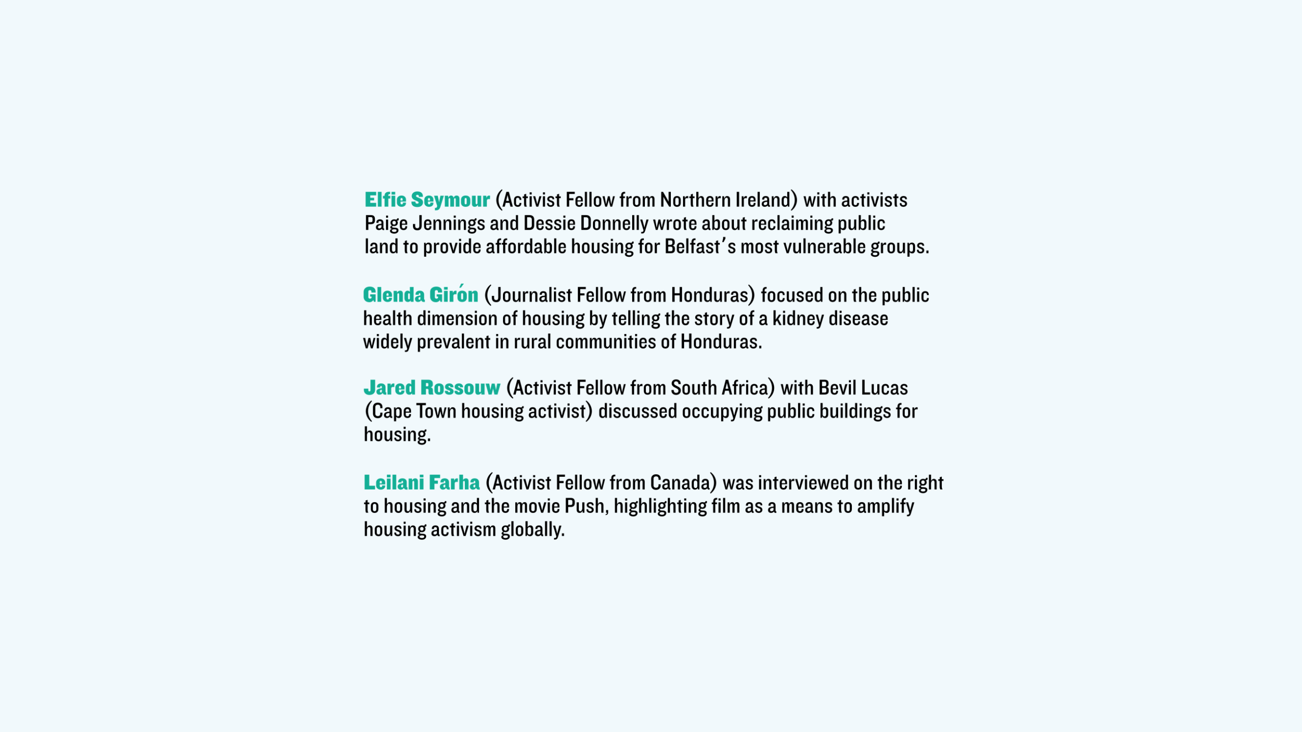 Leilani Farha (Activist Fellow from Canada) was interviewed on the right to housing and the movie Push, highlighting film as a means to amplify housing activism globally.