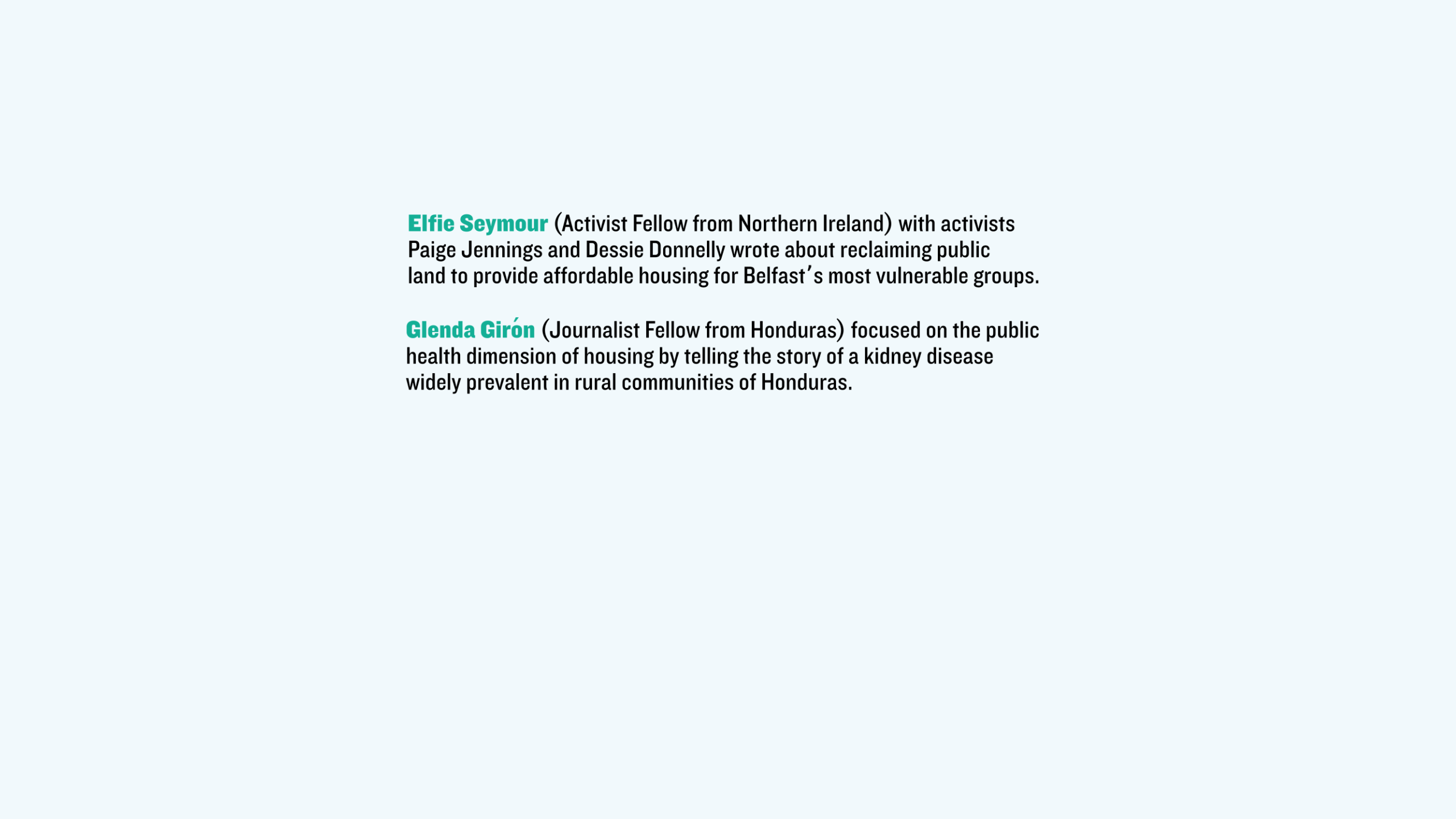 Glenda Girón (Journalist Fellow from Honduras) focused on the public health dimension of housing by telling the story of a kidney disease widely prevalent in rural communities of Honduras.