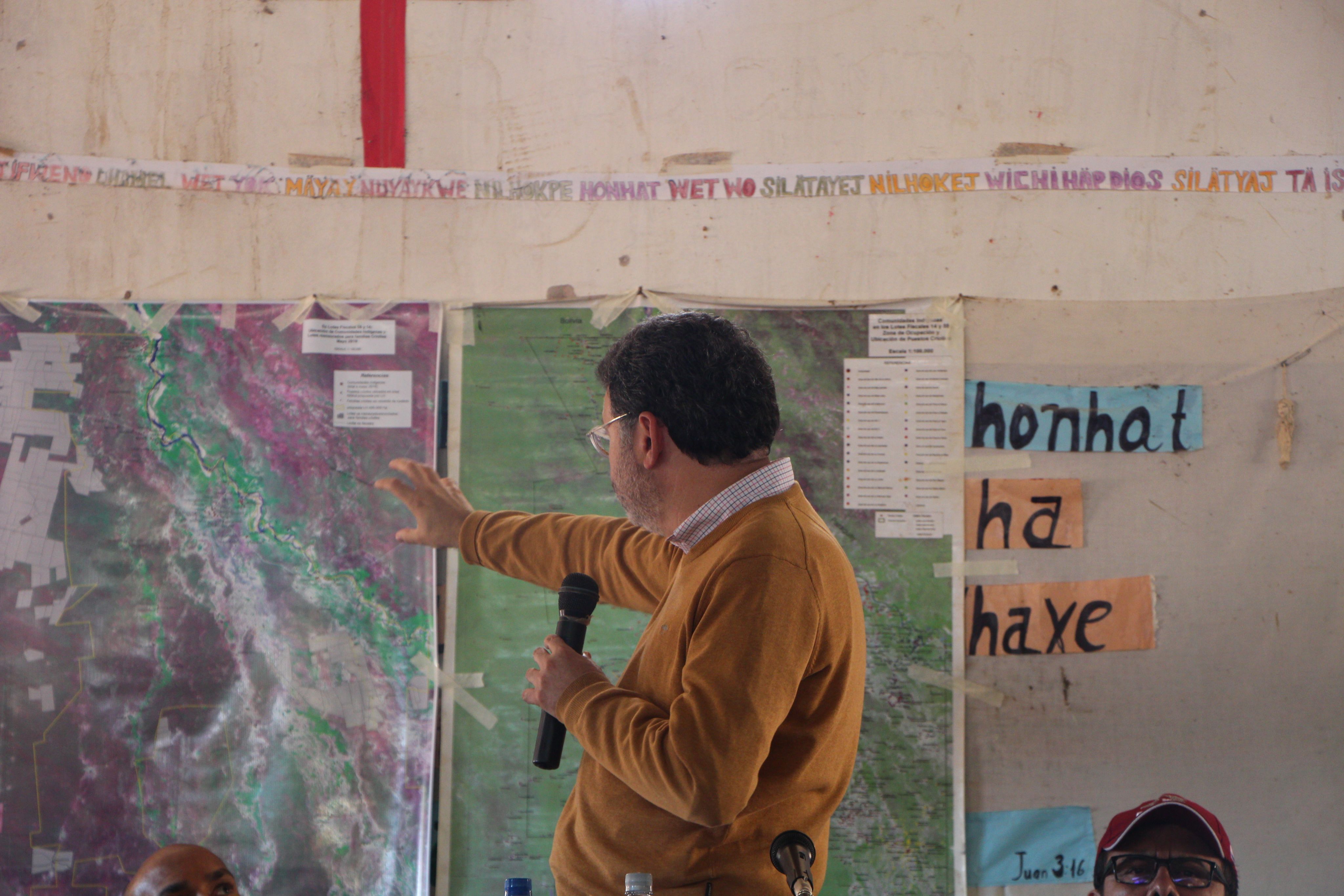 Photo 1: Meeting of Lhaka Honhat Council of Caciques with Inter-American Court staff. Judge Sierra Porto discusses the territory with a map of Lhaka Honhat land in the background. Photo: CELS